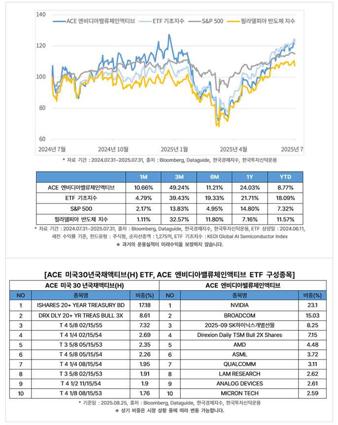 [ 한국투자 ACE 미국30년국채액티브 증권상장지수투자신탁(채권)(H) ] 위험등급 5등급(낮은 위험), 환헤지(NAV의 90%이상~100%이하 범위 내), 합성총보수 연 0.0974%, 2024년도 기준 증권거래비용 0.0171% 발생 (운용 0.035%, AP/LP 0.005%, 신탁 0.005%, 일반사무 0.005%, 기타비용 0.0474%) [ 한국투자 ACE 엔비디아밸류체인액티브 증권상장지수투자신탁(주식) ] 위험등급 2등급(높은 위험), 환노출 합성총보수 연 0.5449%, 2024년도 기준 증권거래비용 0.4874% 발생 (운용 0.42%, AP/LP 0.01%, 신탁 0.01%, 일반사무 0.01%, 기타비용 0.0949%) [ 한국투자 ACE 엔비디아채권혼합블룸버그 증권상장지수투자신탁(채권혼합) ] 위험등급 4등급(보통 위험), 환노출 합성총보수 연 0.1406%, 2024년도 기준 증권거래비용 0.0207% 발생 (운용 0.04%, AP/LP 0.01%, 신탁 0.01%, 일반사무 0.01%, 기타비용 0.0706%) [ 한국투자 ACE 미국10년국채액티브 증권상장지수투자신탁(채권)(H) ] 위험등급 5등급(낮은 위험), 환헤지(NAV의 90%이상~100%이하 범위 내), 총보수 연 0.15% (운용 0.11%, AP/LP 0.01%, 신탁 0.02%, 일반사무 0.01%) [설정 후 1년 미만]