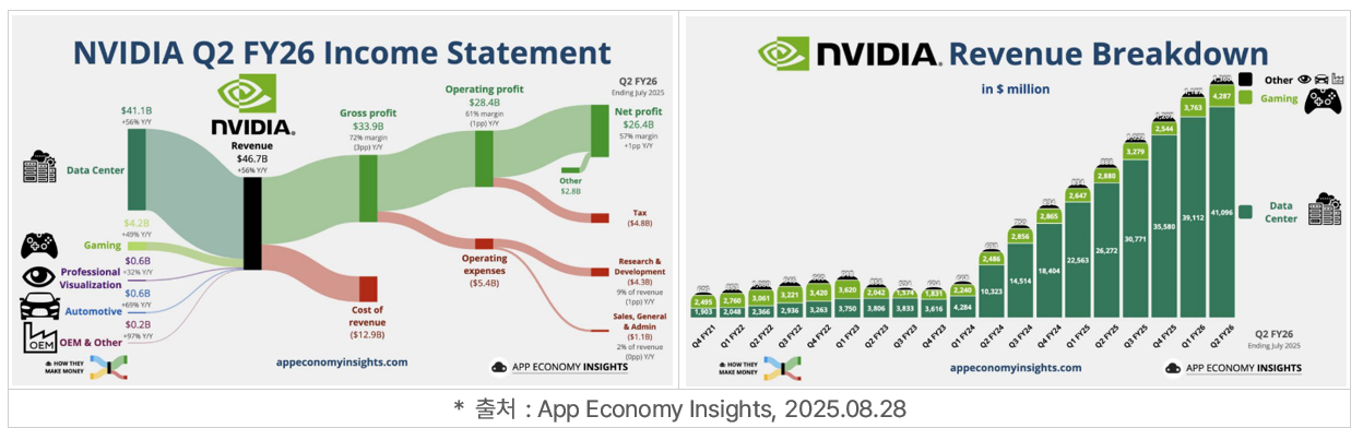 실적 자체는 문제 없었으나, 문제는 중국발 리스크였습니다. 최근 신고가를 경신하는 모습을 보여주었기에 불확실성을 띄고 있는 중국 리스크를 핑계로 시간외에서 소폭 하락했습니다. 하지만 최근 미국 트럼프 정부는 수출 금지 시켰던 중국향 엔비디아 칩 수출을 가능하게끔 면허를 발급하면서, 중국 반도체 판매 수익의 15%를 미국 정부에 지급하는 협약을 체결했다는 보도가 있었습니다. 이건 분명히 중국으로 반도체 수출이 재개될 수 있다는 시그널이기 때문에 3분기 엔비디아의 중국향 매출이 어느정도 나올지에 대한 관심이 쏠리고 있습니다.