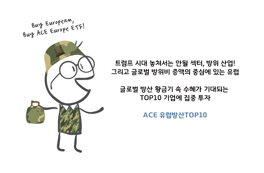 ACE 유럽방산TOP10은 단기적인 이벤트가 아닌, 유럽의 국방비 확대와 정책적 모멘텀을 기반으로 유럽 방위산업에 집중 투자할 수 있는 상품입니다. 독일 라인메탈, 프랑스 탈레스, 영국 BAE 시스템즈 등 글로벌 방산을 선도하는 기업에 투자하며, 방위산업뿐 아니라 항공·우주·위성 등 첨단 무기 체계 개발 및 민간 영역까지 확장되는 장기 성장성까지 고려했습니다. 안보가 핵심 키워드로 떠오른 지금, ACE 유럽방산TOP10이 여러분의 포트폴리오에 새로운 성장 기회를 더해줄 수 있기를 기대합니다.