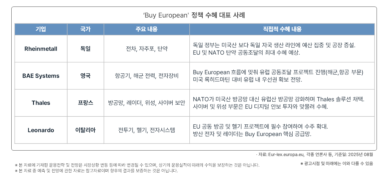 유럽연합이 ‘바이 유러피안(Buy European)’ 정책을 통해 이 막대한 자금을 외부로 유출하지 않고 유럽 내부에서 돌 수 있도록 적극적으로 지원하고 있다는 점 또한 유럽 방산 기업들에게는 긍정적인 부분입니다. 방위 지출을 2030년까지 50%, 2035년까지 60%를 목표로 유럽 내에서 조달하겠다는 이 방침은 유럽 방산 기업들에게 매우 유리한 정책이기 때문에 이들은 중장기적으로도 지속적인 성장세를 이어갈 수 있을 것으로 전망되고 있습니다. |