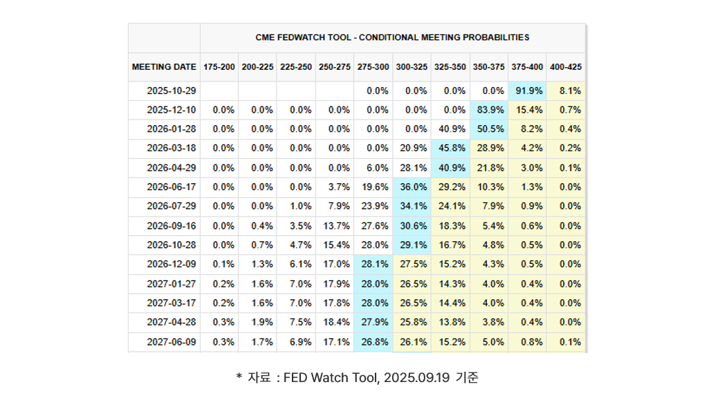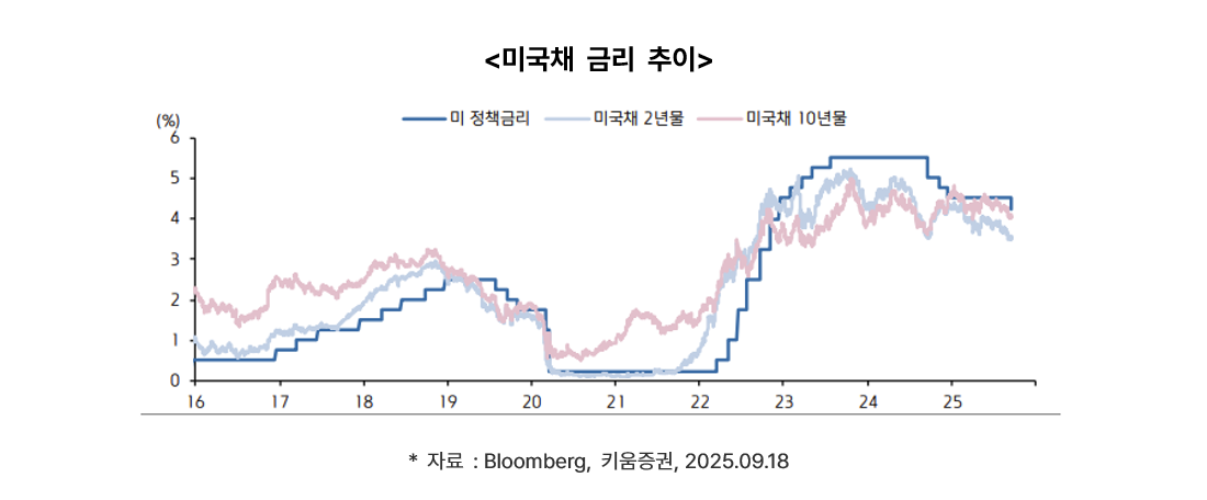 [9월 FOMC Review – 조심스럽게 시작된 금리 인하 사이클] 어느정도 예상되었던 9월 FOMC에서 9개월만에 기준금리 25bp 인하가 결정되었습니다. 이후 점도표 상 올해 연내 추가 금리 인하는 2회 예상되고 있고, 2026년 및 2027년은 각각 1회씩 인하로 기존 의견 유지하였습니다.