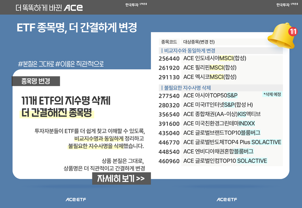 3. 지수사명이 포함되어 있던 ETF의 명칭 조정 투자자분들이 ETF를 더 쉽게 찾고 이해할 수 있도록, 비교지수명과 동일하게 정리하고 불필요한 지수사명을 삭제했습니다. 상품 본질은 그대로, 상품명은 더 직관적이고 간결하게 변경하였습니다. 자세한 사항이 궁금하시다면 아래의 [공지 바로가기] 버튼을 클릭해주세요! |