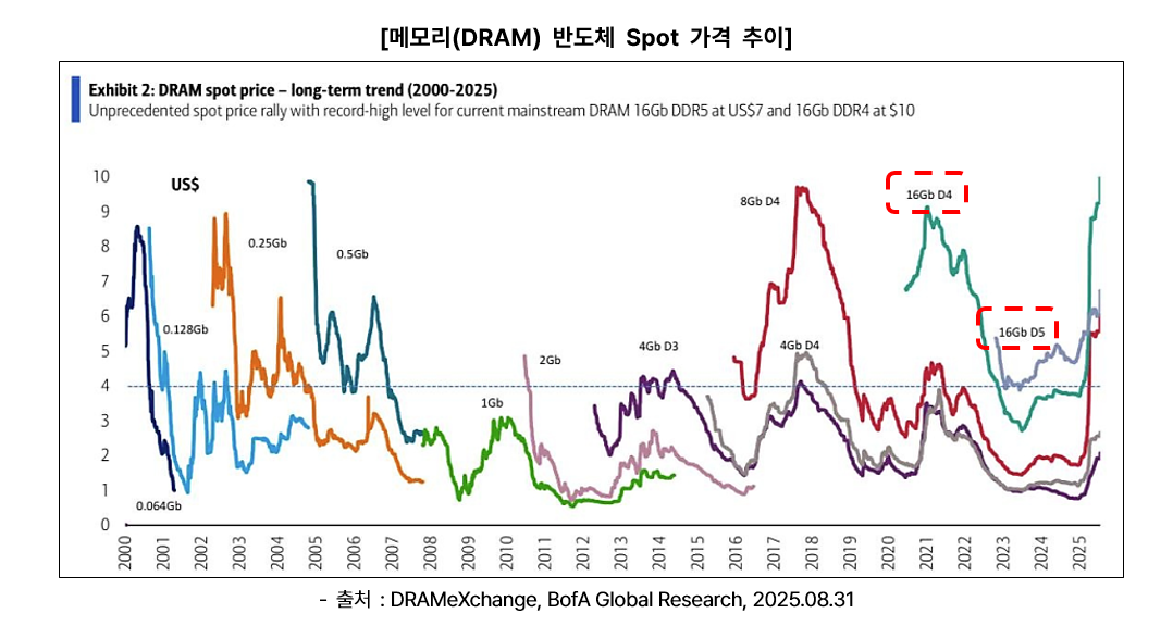 1) 양치기 소년, 아픈 손가락 삼성전자이전에도 한번 다뤘었던 “삼성전자, 테슬라와 2조원 규모 반도체 장기 공급 계약 체결” [NEWS] 테슬라가 삼성, LG에 터트린 잭팟, 한국 기업의 반사이익은 지금부터 예상?! (ACE 테슬라밸류체인액티브, ACE AI반도체포커스)이 시작이었습니다. 부진했던 삼성파운드리의 부활 신호탄이었고 애플 이미지센서(CMOS CIS) 수주까지 성공하여 추가적인 고객사 수주에 대한 이야기들이 지속적으로 들리고 있는 상황입니다. 동시에 양치기 소년이었던 삼성전자의 엔비디아향 HBM3E 12단 퀄테스트 및 납품이 가시화되었고 2026년 엔비디아 루빈 칩에 탑재될 HBM4부터 엔비디아의 삼성전자 의존도가 확대될 것이라는 전망이 나오고 있습니다. 이로써 삼성전자는 파운드리+HBM 사업의 부진을 이겨내고 있는 상황인데.. 여기에 또 다른 좋은 소식이 있으니, 바로 DRAM과 NAND 가격 상승세, 레거시 메모리 반도체의 부활입니다.