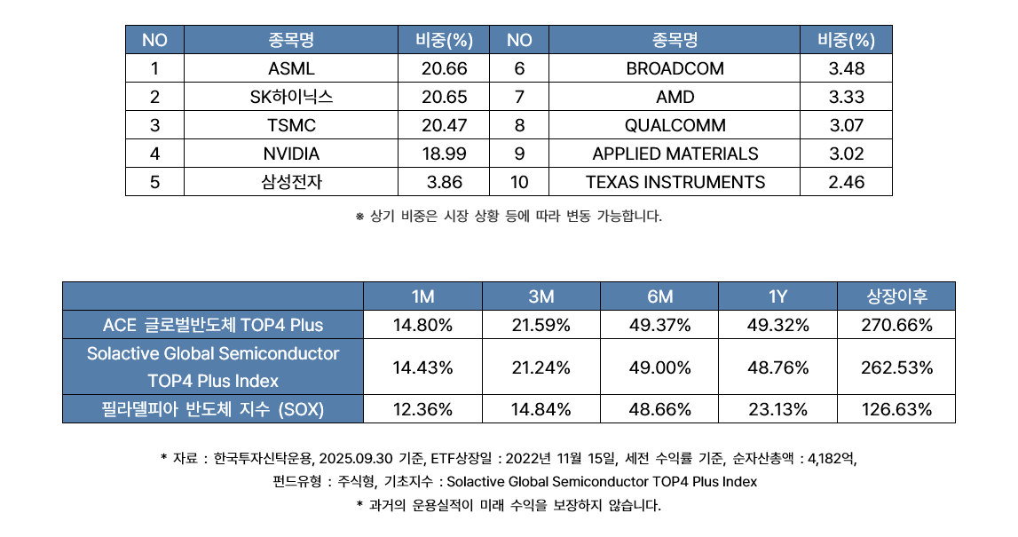 [글로벌 반도체 시장 대장만 모았다! ‘ACE 글로벌반도체TOP4 Plus’ ETF (종목코드 446770)] 글로벌 반도체 시장의 시스템반도체, 메모리, 파운드리, 반도체 장비 각 영역에서 대표 기업을 4종목을 20%씩 투자하는 글로벌 반도체 시장 특화 상품 |