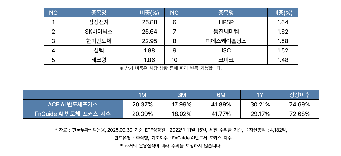 [메모리반도체 사이클에 올라타려면, ‘ACE AI반도체포커스’ ETF (종목코드 469150)] 대한민국 대표 반도체 기업 삼성전자와 SK하이닉스, 그리고 반도체 소부장 기업들에 투자하여 반도체 산업의 업황 전체에 투자하는 대한민국 반도체 시장 특화 상품 |