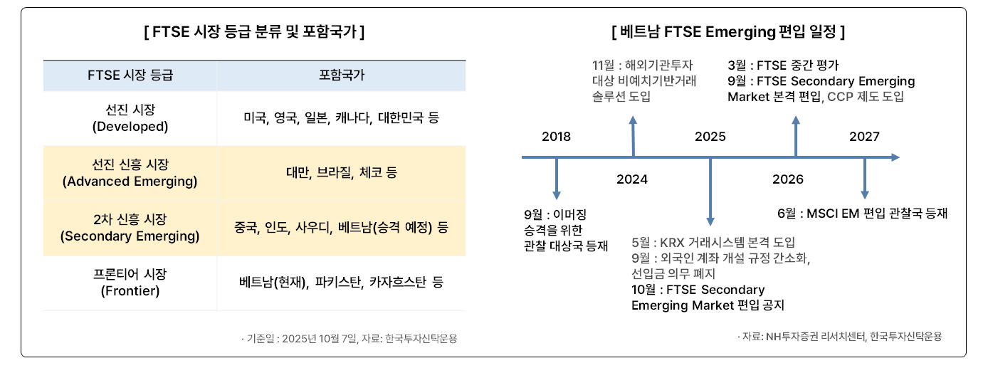 FTSE 러셀이 베트남을 프런티어(Frontier)에서 세컨더리 이머징(Secondary Emerging) 시장으로 격상했습니다. 이는 지난 2018년 9월 이머징 승격을 위한 베트남 관찰대상국 등재 이후 7년 만의 일인데요. 이번 승격에는 외국인 선입금 의무가 폐지된 것과 2025년 5월 KRX 시스템 도입을 통해 결제·거래 인프라가 국제 기준에 한층 근접한 점이 주요하게 작용한 것으로 보입니다. 2026년 3월 중간 점검을 통과하면 베트남 증시는 이머징 시장 격상이 최종 확정될 예정인데요. 비중 자체는 크지 않지만 FTSE 이머징 지수를 추종하는 글로벌 패시브 자금 규모 등을 감안하면 이번 승격은 베트남 증시에 확실히 긍정적인 이벤트입니다. |