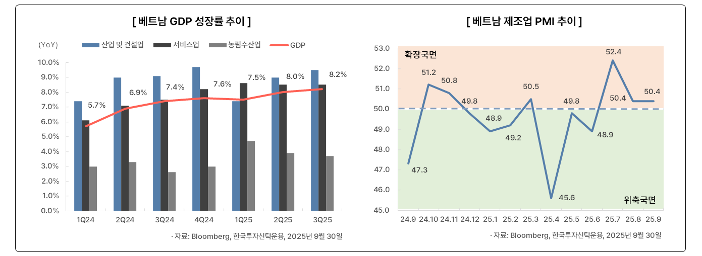 [강력하고 지속적인 성장 모멘텀을 보유한 베트남] 이뿐만 아니라 지속적으로 높은 수준의 GDP 성장률, 특정 산업에 치우치지 않는 균형 잡힌 성장세를 보이고 있으며 정부 주도의 강력한 부양책으로 성장을 더욱 가속화해 나가고 있다는 점 또한 베트남 증시의 매력 포인트입니다. 베트남 정부는 2025년 8%, 2026년 10%의 GDP 고성장 목표를 견지하고 있으며 이를 달성하기 위해 공공투자 확대, 내수 진작, 금융시장 구조개선 등 정책적 노력을 아끼지 않고 있습니다. |
