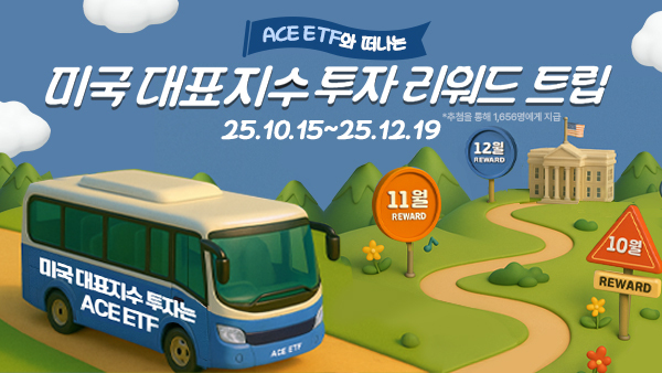 📣 현재 진행중인 이벤트! ✔︎ [ACE 미국대표지수 매수 인증 이벤트 ‘투자 리워드 트립’] (10/15~12/19) ACE 미국대표지수 ETF 2종, ACE 미국S&P500 (종목코드 360200) 또는 ACE 미국나스닥100 (종목코드 367380)를 매수하고 인증해주세요! 이벤트 기간 동안 총 1,656분께 추첨을 통해 다양한 경품🎁을 드립니다.