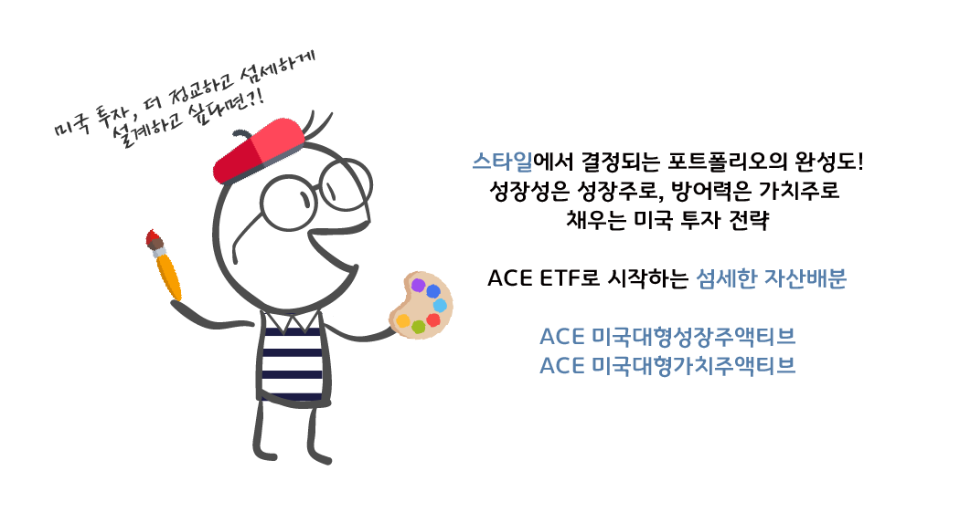 그 변화의 해답이 될 새로운 솔루션, ACE 미국대형성장주액티브 ETF, ACE 미국대형가치주액티브 ETF와 함께 여러분의 포트폴리오를 다시 점검해보고, 더 정교하고 섬세한 미국 투자 설계를 시작할 기회가 되길 바랍니다.