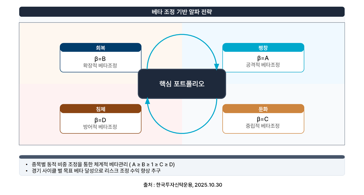 * 경기 확장 국면(회복·팽창) → 민감도가 높은 ‘하이베타 종목’의 비중을 확대해 상승장에서 알파(초과성과) 추구 * 경기 수축 국면(둔화·침체) → 민감도가 낮은 ‘로우베타 종목’을 편입해 하락장에서 손실 방어력 강화 추구