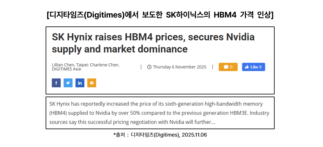 [엔비디아와의 밀당에 성공한 SK하이닉스] 통상 HBM의 계약은 5~6월경에 내년 물량을 미리 계약하는데, 올해 2025년 6~7월 SK하이닉스에게서 내년 HBM 물량 계약 소식이 들리지 않았습니다. 그런 탓인지 SK하이닉스의 주가는 7~8월에 횡보하는 모습을 보여주었습니다. 그러던 와중 DRAM 가격이 급격히 상승하면서 다시 SK하이닉스의 주가는 9월부터 상승하기 시작했고, 지난 11월 4일 실적 컨퍼런스콜에서 “수요가 급증해 내년 DRAM과 NAND를 완판했다”고 밝히며. “내년 HBM 공급 협의를 모두 완료했다”고 전했습니다. 드디어 엔비디아와의 HBM4계약이 성사된거죠. 긴 협상 끝에 SK하이닉스는 HBM 기술력을 바탕으로 엔비디아에 가격을 50% 올리는 갑질(?)을 하게 된 것입니다.