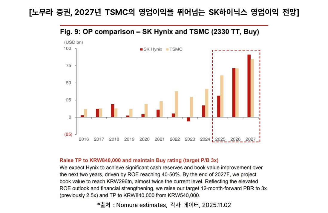그럼에도 불구하고 최근 일본 투자은행 노무라증권이 SK하이닉스의 2027년 영업이익이 TSMC를 넘어설 것이라는 파격적인 전망(*출처 : Nomura estimates, 2025.11.02)을 하며 목표주가를 84만원으로 55%나 대폭 상향 조정하였는데, 이 역시 향후 메모리 호황이 2027년까지 지속됨에 따라 이익전망치를 128조원으로 46% 큰 폭으로 상향시켰기 때문입니다. 물론 노무라 증권의 전망이 100% 다 맞다고 볼 수는 없지만, 글로벌 투자은행 씨티(Citi) 역시 SK하이닉스의 영업이익 전망치를 기존 64조원에서 81조원까지 27% 상향 조정했습니다. (*출처 : Citi estimates, 2025.10.20) |