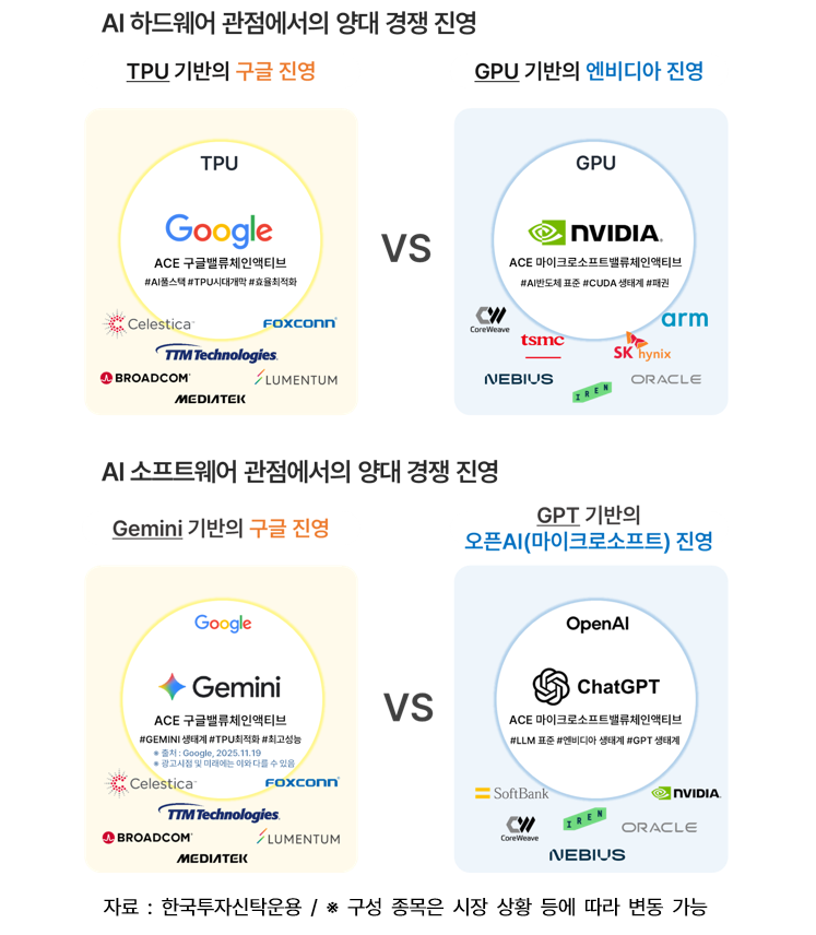 실제로 엔비디아가 주도해온 GPU 기반 연산 구조는 여전히 AI 모델 개발과 추론 영역에서 핵심적인 역할을 수행하며 반도체 아키텍처, CUDA 플랫폼, HBM 기반 공급망 등 높은 진입 장벽을 유지하고 있습니다. 동시에 구글은 TPU 기반 연산, Gemini 모델, GCP 인프라를 중심으로 효율성과 최적화를 강화한 AI 풀스택 생태계를 구축하며 또 다른 성장 축을 형성하고 있습니다.