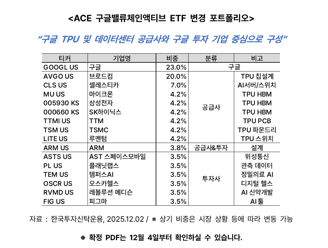 2025년 12월, ACE 구글밸류체인액티브 ETF의 포트폴리오가 전면 개편됩니다. 그동안은 구글 및 구글 밸류체인 기업뿐 아니라, 구글과 동반성장이 가능한 경쟁사까지 폭넓게 투자해왔으나, 최근 AI 산업 구조가 크게 변화함에 따라 구글 중심 생태계에 집중하는 방향으로 포트폴리오를 재정비하였습니다. 이에 리밸런싱 관련 세부 내용을 안내드리오니 투자자 분들께서는 투자에 참고 부탁드립니다. |