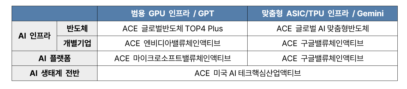 ✔️ GPU vs TPU로 대표되는 AI 산업 분화 국면 속에서, 투자 방향과 전략에 맞춰 선택할 수 있는 ACE의 세분화된 테크 ETF 라인업을 소개드립니다. |