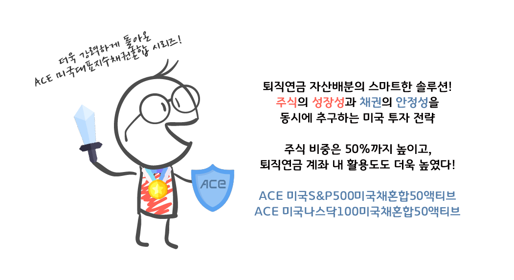 그리고 채권혼합형 ETF는 퇴직연금 계좌에서 100% 한도로 투자 가능하기 때문에 다양한 조합으로 활용 가능한데요. 미국 대표지수의 성장성을 조금 더 적극적으로 추구하면서 주식형 ETF 대비 변동성은 상대적으로 완화할 수 있는 ACE 미국대표지수채권혼합 시리즈에 대해 자세히 알아보고 싶다면? 아래 블로그 글을 통해 확인해보세요! |