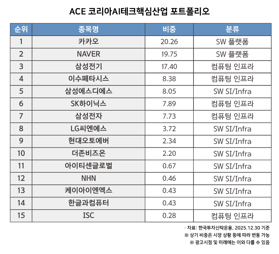 [리밸런싱 핵심 포인트 2: SW 플랫폼 40% – 한국형 소버린 AI의 중심] 컴퓨팅 인프라가 AI의 몸통이라면, 소프트웨어와 플랫폼은 AI의 두뇌입니다. ACE 코리아AI테크핵심산업 ETF는 NAVER와 카카오를 중심으로 AI 서비스 확산의 핵심 축이 되는 영역에 주목했습니다. 이는 단순히 플랫폼 기업에 투자한다는 의미가 아니라, 자국어 데이터와 서비스 경쟁력을 기반으로 한 한국형 소버린 AI 생태계를 함께 바라보는 전략입니다. AI가 연구 단계를 넘어 실제 서비스로 확장될수록, 결국 AI를 구현하고 사용자와 연결할 수 있는 플랫폼 기업의 역할은 더욱 중요해집니다. ※ 구성 종목은 시장 상황 등에 따라 변동 가능