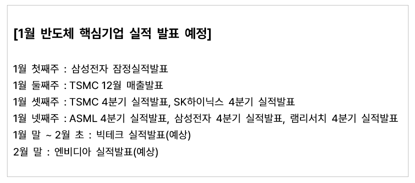 2026년의 첫 주말 새해 벽두부터 미국의 베네수엘라 공습 뉴스로 전세계가 정신이 없는 상황입니다 @_@ 1월은 반도체 투자자분들에게 중요한 시점이라고 생각되는데요, 아래와 같이 반도체 핵심기업들의 실적 발표가 예정되어 있기 때문입니다. 그리고 2월까지 글로벌 빅테크들과 엔비디아의 실적 발표도 예정되어 있기 때문에 일정 한번 체크하고 가면 좋을 것 같습니다!