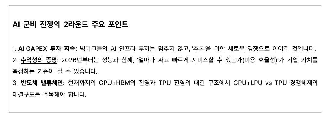 엔비디아는 빠른 속도를 내는 '그록'을 품음으로써, 약점이었던 '추론’ 영역에서의 비용과 속도 문제를 단숨에 해결하려 하고 있습니다. 구글에게 한 방 먹은 줄 알았던 엔비디아가, 오히려 더 무서운 무기를 들고 링 위로 복귀한 것이기 때문에 2026년, AI 반도체 전쟁은 더욱 뜨거워질 것입니다. |