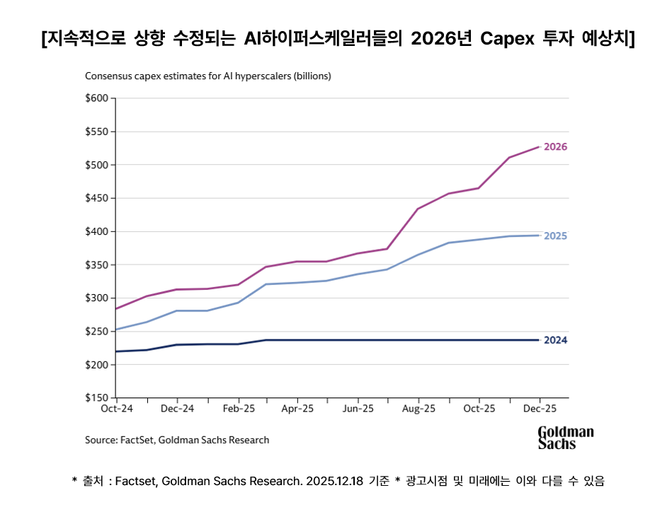 사실 시장에서는 AI Capex 투자에 대한 피크아웃 우려는 항상 있었지만, 그 예측은 항상 틀려왔고 지속적으로 추정치를 상향 시키고 있는 상황입니다. 그렇기 때문에 AI 군비 경쟁 2라운드는 이제 막 시작하지 않았나 예상하고 있습니다.
