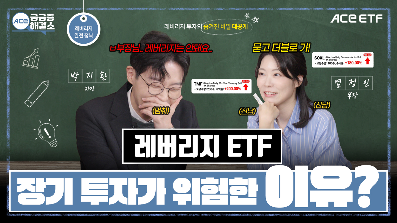 투자자 분들의 궁금증에 ACE ETF가 직접 답해드리는 콘텐츠! ACE 궁금증해결소 “[EP.08] 레버리지 ETF, 장기 투자가 위험한 이유? 근데 레버리지보다 좋은 성과내는 ETF도 있다고?” 콘텐츠가 업로드 되었습니다. 야수의 심장을 가진 당신, 레버리지 ETF의 구조에 대해서는 어디까지 이해하고 계신가요?! 👀 레버리지 ETF 투자, 고민하고 계신다면? 아래 영상을 통해 자세히 알아보고 나에게 적합한 ETF를 찾아보세요!