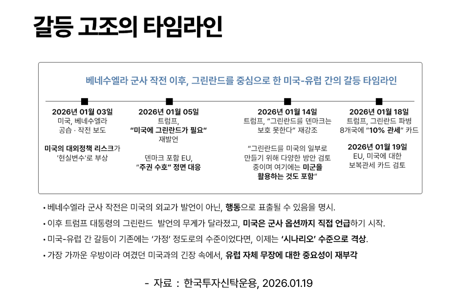 : 얼마 안된 2026년 1월 3일에 있었던 니콜라스 마두로 대통령 압송과 같은 베네수엘라 군사 작전 사례는 미국의 외교적 수사가 언제든 실질적인 군사 행동으로 이어질 수 있음을 시장에 각인시켰습니다. 이제 시장은 미국의 외교 리스크를 '말의 수위'가 아니라 '실제 행동 가능성' 그 자체로 평가하기 시작했습니다.