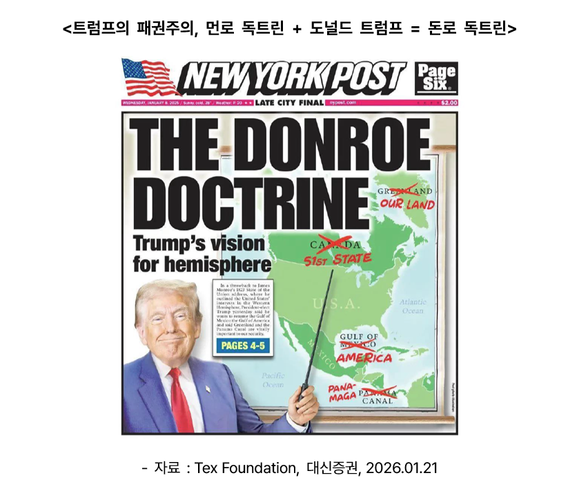 : 최근 다보스 포럼 이후 단기적인 긴장은 다소 완화된 모습이지만, 그린란드의 전략적 가치와 미국의 개입 가능성은 여전히 잠재 리스크로 남아 있습니다. 북극 항로의 관문이자 희토류 등 전략 자원의 보고인 그린란드는, 시간이 갈수록 군사적·지정학적 중요성이 더욱 커지고 있기 때문입니다.