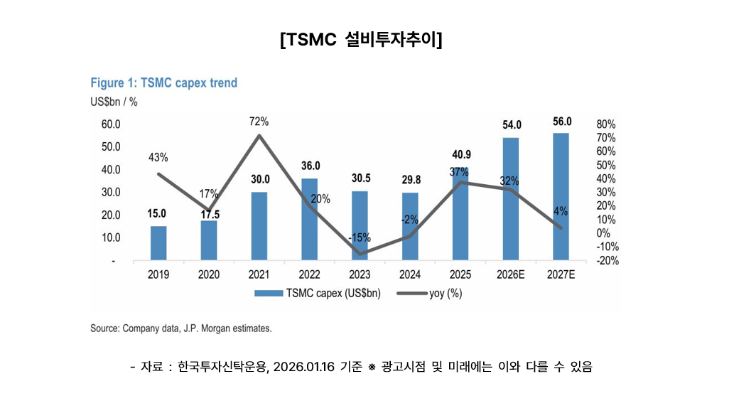 TSMC는 2024년 AI 붐이 확실할 때도 설비투자를 늘리지 않았던 기업입니다. 그런 기업이 2년 연속(2025년, 2026년) 30%대의 설비투자 증액을 결정했다는 것은 "수요가 굉장히 확실하다"는 가장 강력한 시그널로 해석해볼 수 있습니다.