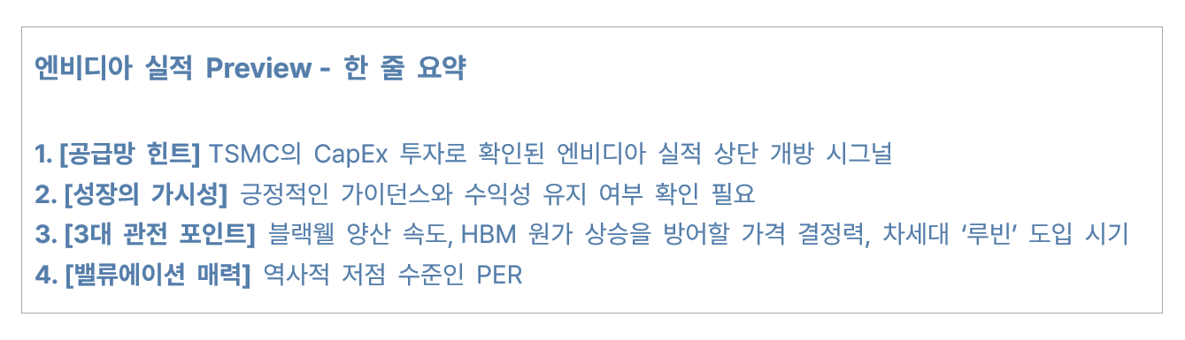 * 마이크로소프트·구글·메타 등 하이퍼스케일러들의 대규모 설비 투자(CapEx)가 실제 엔비디아 주문 물량으로 얼마나 연결되었는지 * 다음 분기 가이던스가 시장 기대치를 상회할 수 있는지 * AI 수요의 지속성에 대한 경영진의 확신이 확인되는지 * 블랙웰 수요 및 출하량, 다음 세대 반도체 시리즈인 파인만(Feynman) 개발 및 공개 여부 가 이번 실적의 핵심 변수로 작용할 전망입니다.