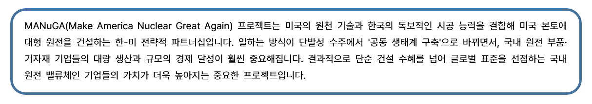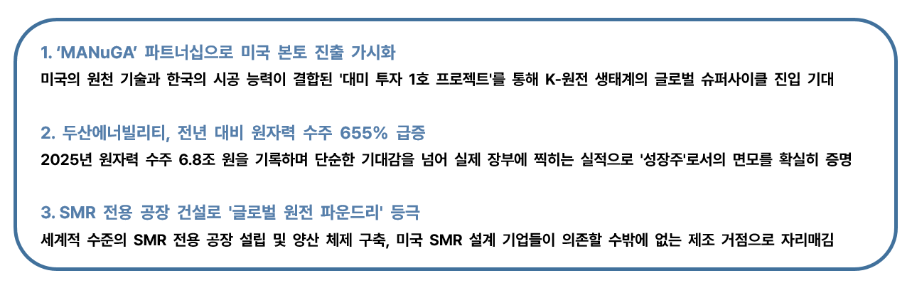 1. 한-미 원전 전략적 파트너십(MANuGA) : ‘원자력’ 대미 투자 프로젝트 최근 K원전 섹터의 가장 강력한 주가 상승 엔진은 ‘대미 투자 1호 프로젝트’에 대한 기대감이었습니다.