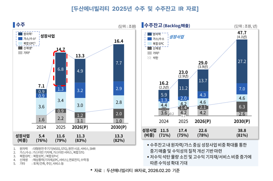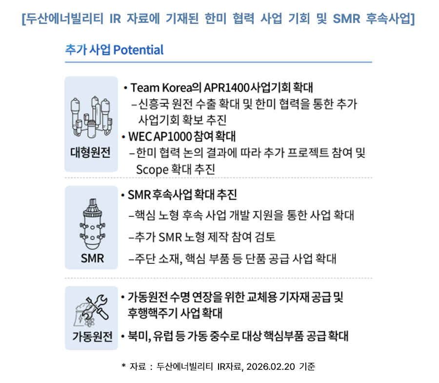 두산에너빌리티는 창원에 8,068억 원을 투자해 SMR 전용 공장을 건설하며, 연간 20기 규모의 생산 체제를 구축한다는 소식을 전했습니다. (출처 : 두산에너빌리티 DART 공시, 2025.12.17) 동시에 올해 SMR 수주 목표 또한 1.1조 원으로 상향 조정하면서 본격적인 ‘SMR 드라이브’가 시작되었다고 볼 수 있게 되었습니다. (출처 : 두산에너빌리티 IR 공시, 2026.02.11)