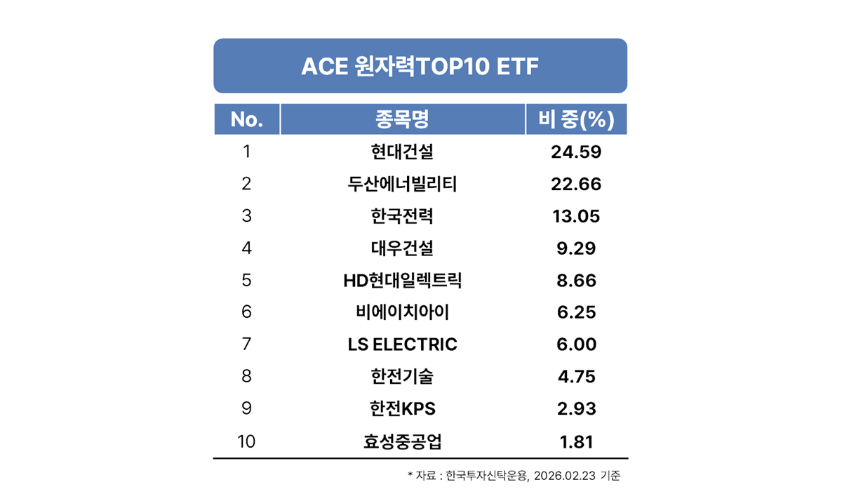 [ ACE 엔비디아밸류체인액티브 ETF ] 위험등급 2등급(높은 위험), 환노출 합성총보수 연 0.5561% (운용 0.42%, AP/LP 0.01%, 신탁 0.01%, 일반사무 0.01%, 기타비용 0.1061%) 2025년도 기준 증권거래비용 0.5080% 발생 [ ACE 엔비디아채권혼합 ETF ] 위험등급 3등급(다소 높은 위험), 환노출 합성총보수 연 0.1309% (운용 0.04%, AP/LP 0.01%, 신탁 0.01%, 일반사무 0.01%, 기타비용 0.0609%) 2025년도 기준 증권거래비용 0.0163% 발생 [ ACE 글로벌반도체TOP4 Plus ETF ] 위험등급 1등급(매우 높은 위험), 환노출 합성총보수 연 0.5112% (운용 0.39%, AP/LP 0.02%, 신탁 0.02%, 일반사무 0.02%, 기타비용 0.0612%) 2025년도 기준 증권거래비용 0.1005% 발생 [ ACE 원자력TOP10 ETF ] 위험등급 1등급(매우 높은 위험) 합성총보수 연 0.3530% (운용 0.26%, AP/LP 0.01%, 신탁 0.015%, 일반사무 0.015%, 기타비용 0.0530%) 2025년도 기준 증권거래비용 0.0559% 발생