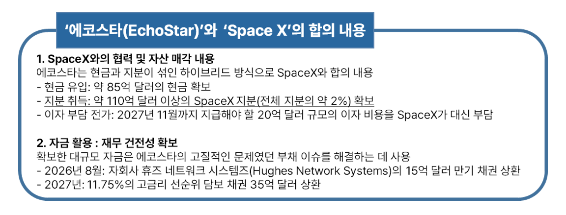 에코스타는 위성 방송 혹은 위성 통신 회사 정도의 보통의 회사였는데, 2025년 시장을 놀라게한 발표를 하였습니다. 바로 에코스타와 SpaceX 간의 자산 매각안 발표였습니다. 에코스타는 보유하고 있던 AWS-4 및 H-Block 무선 주파수(스펙트럼) 라이선스 전체를 SpaceX에 200억 달러에 매각하기로 하였습니다. 그리고 그 중 약 110억 달러는 SpaceX의 주식으로 받았습니다. (* 출처 : Satnews, 2026.03.03 기준)