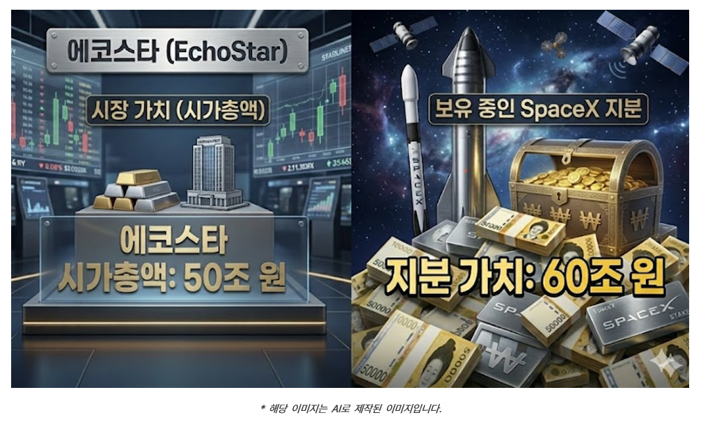 그런데 중요한 것은 에코스타의 현재 시가총액이 약 379억 달러(2026.04.15 기준, ※ 광고시점 및 미래에는 이와 다를 수 있음)라는 점입니다. 한화로 약 50조원 수준인 것이죠. 보유하고 있는 SpaceX의 지분가치만 약 60조원인데, 시가총액이 50조원?