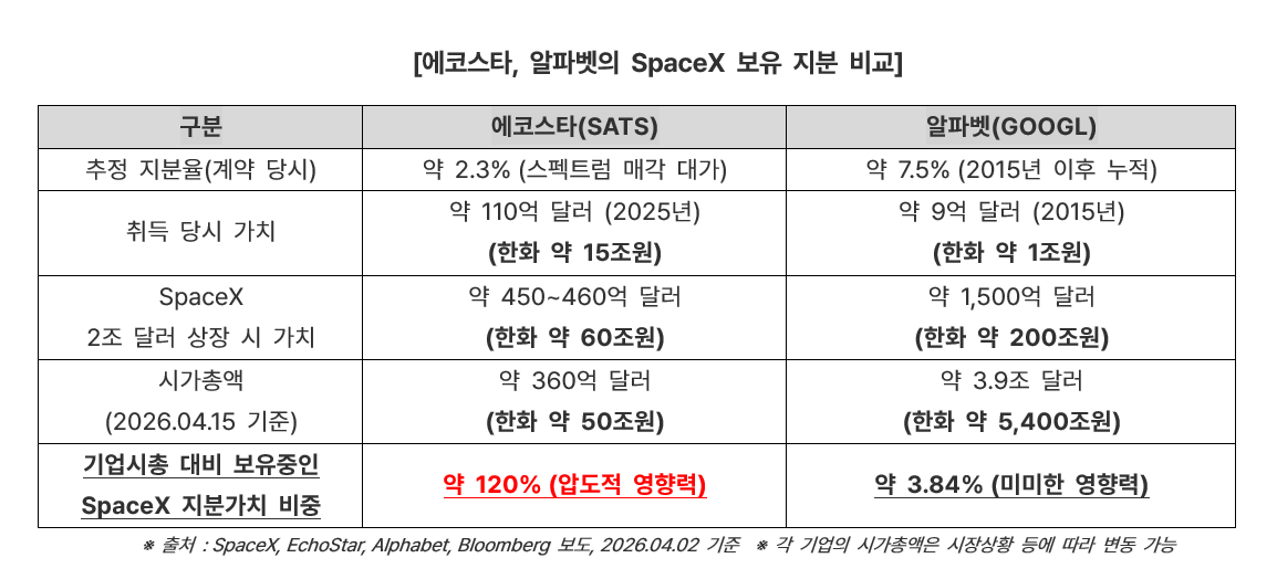 알파벳(구글)은 SpaceX의 지분 약 7.5%를 보유하고 있는 것으로 알려졌는데요(투자 당시), SpaceX가 2조달러에 상장한다고 가정 시, 이 지분가치는 약 1,500억 달러, 한화로 약 200조원 규모입니다. 지분 가치만 보면 에코스타가 보유한것보다 3배가 크죠. 하지만 알파벳의 시가총액은 약 3.9조달러(2026.04.15 기준) 즉 5,400조원 입니다. 알파벳의 시가총액 대비 보유하고 있는 SpaceX의 지분은 3.84%로 미미한 수준이죠. * 광고시점 및 미래에는 이와 다를 수 있음