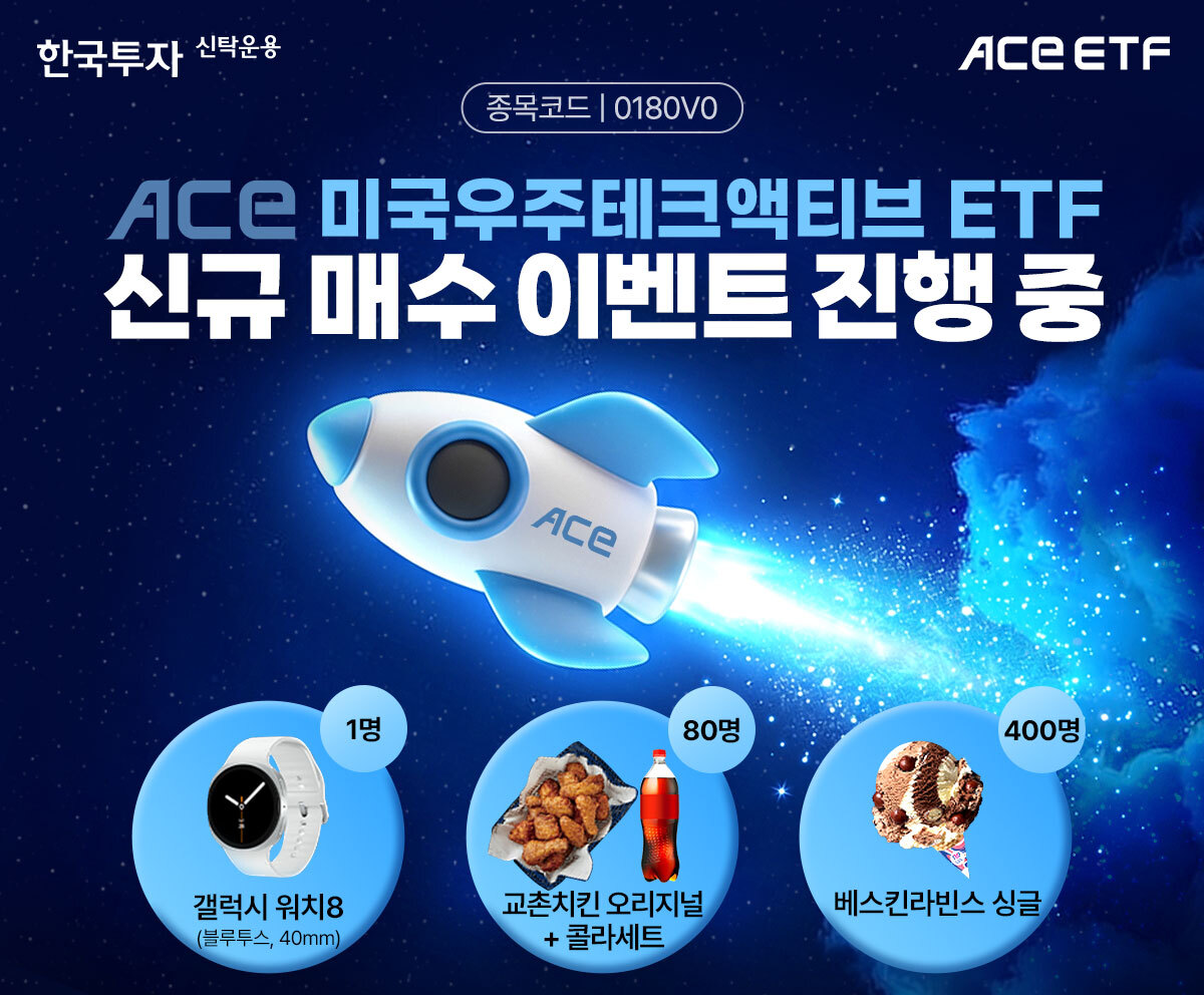 4월 14일에 상장한 ETF! 순수 우주 밸류체인에 집중하는 액티브 투자 솔루션, ACE 미국우주테크액티브 ETF 매수하고 경품 받아가세요! 이벤트 기간[4/14(화)~5/13(수)] 동안 ETF 10주 이상 신규 매수 내역을 인증해주시면 추첨을 통해 1분께 갤럭시 워치8(블루투스, 40mm)을, 80분께 교촌치킨 오리지널+콜라세트를, 400분께 배스킨라빈스 싱글 기프티콘을 드립니다. ☺